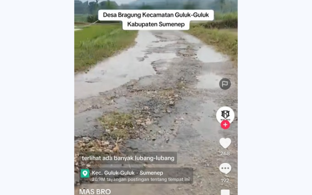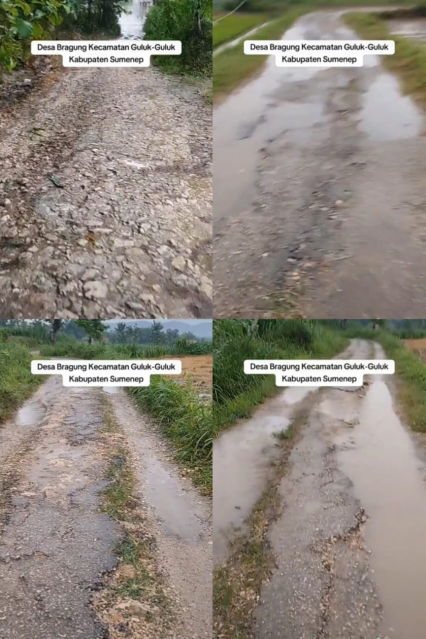 SUMENEP, PROPUBLISH.ID – Kondisi jalan di Desa Bragung, Kecamatan Guluk-Guluk, Kabupaten Sumenep, kembali menjadi sorotan warga. Melalui media sosial, masyarakat mengeluhkan rusaknya infrastruktur jalan yang dinilai sangat memprihatinkan. Keluhan tersebut disampaikan dalam unggahan video TikTok yang diunggah akun @MAS BRO, Rabu (25/12/2024).