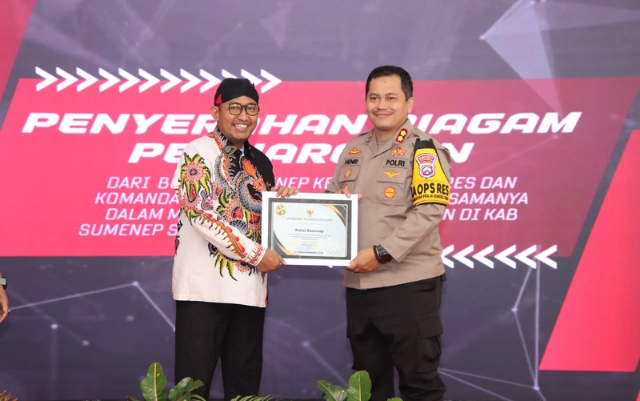 Sumenep – Bupati Sumenep, Fauzi Wongsojudo, memberikan penghargaan kepada Kapolres Sumenep AKBP Henri Noveri Santoso atas inisiatifnya dalam mendukung ketahanan pangan melalui program Asta Cita Presiden Republik Indonesia, Prabowo Subianto. Penghargaan tersebut diserahkan dalam acara ramah tamah di Pendopo Agung Kraton Sumenep, Kamis (23/01/2025).